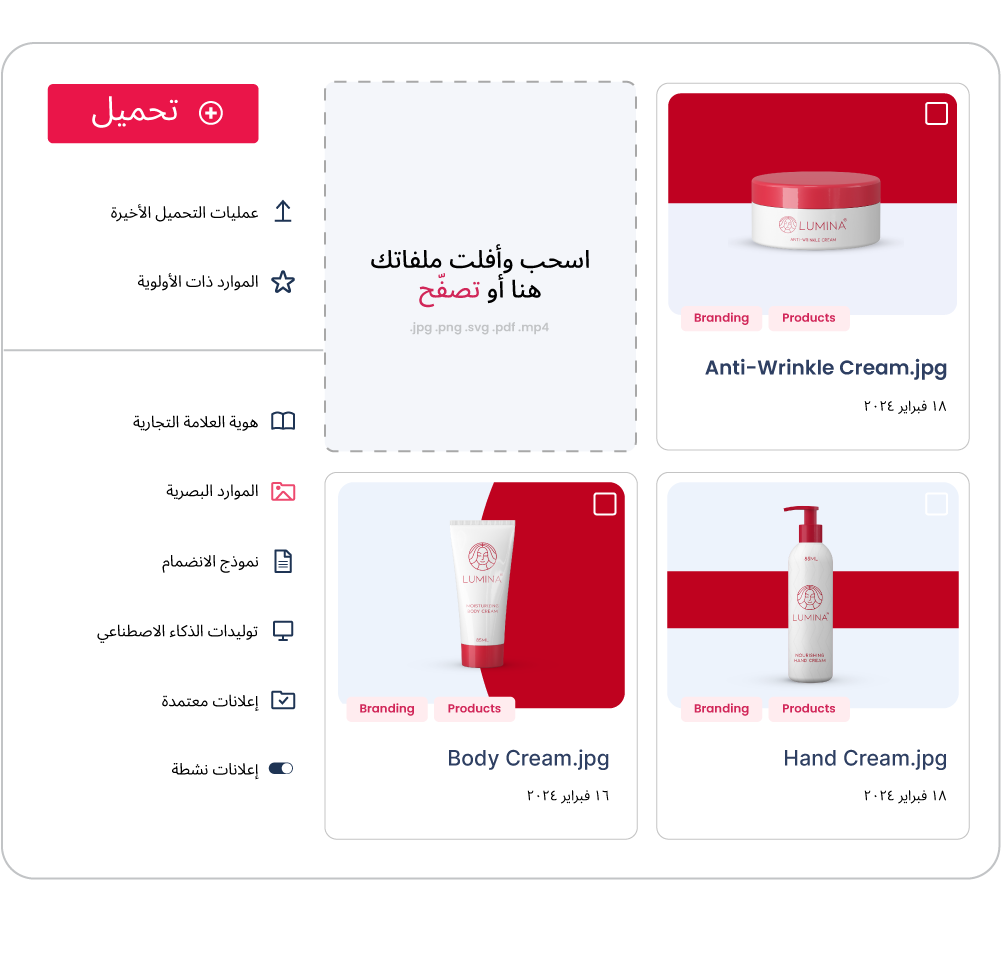 قم بتحميل كل محتوى علامتك التجارية إلى منصة إدارة الأصول الرقمية.