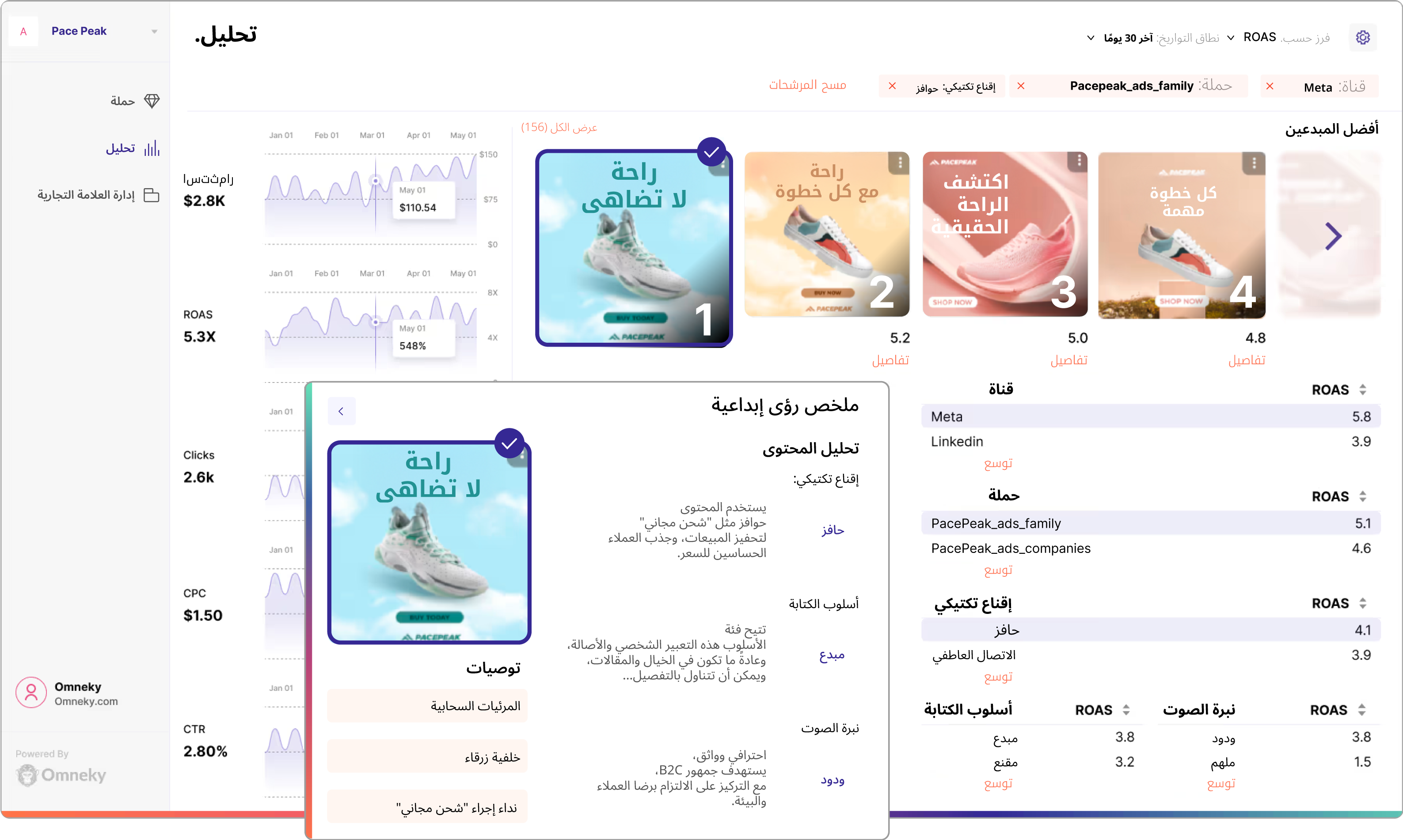 تعرف على نجاح إعلانك من خلال الرؤى التفصيلية. تكشف التحليلات الإبداعية من Omneky عن أفضل التصميمات والقنوات والحملات أداءً، مما يساعدك على تحسين الجهود المستقبلية.