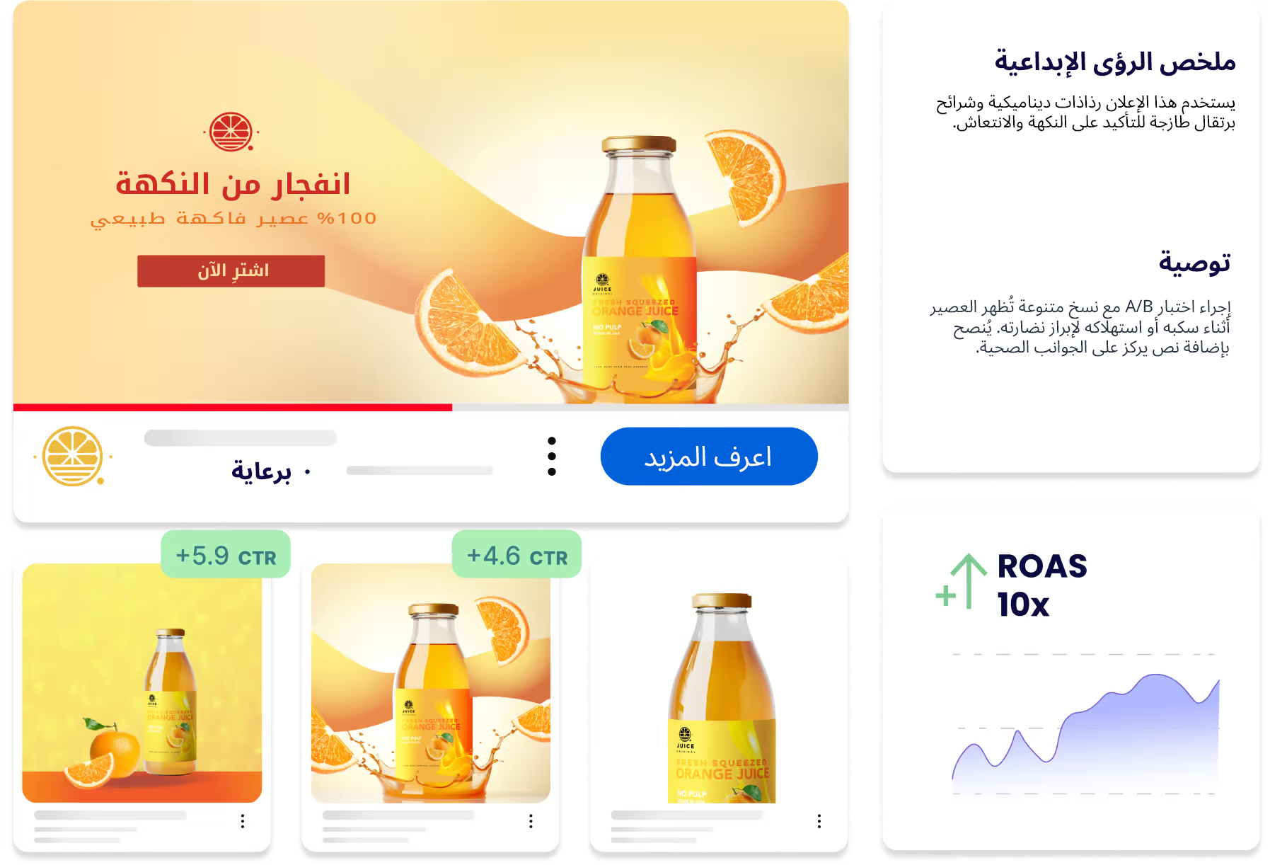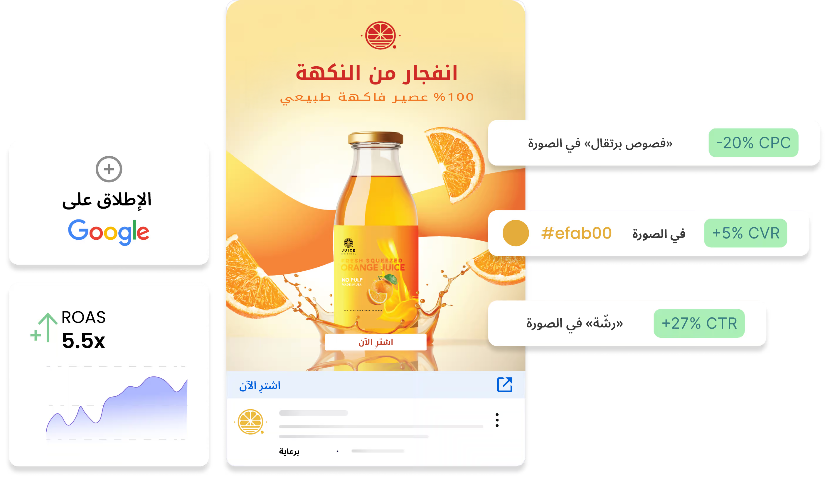 استخدم الذكاء الاصطناعي الخاص بنا لإنشاء تصميمات جذابة بصريًا تناسب كل نسبة عرض إلى ارتفاع إعلان Google وموضع، وتوسيع نطاق حملاتك وتعزيز النتائج في أي وقت من الأوقات على الإطلاق.