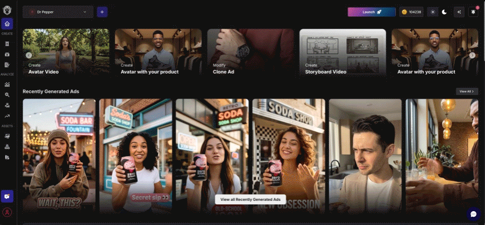 - Recently generated ads to Edit, create “More Like This” or Animate to Video