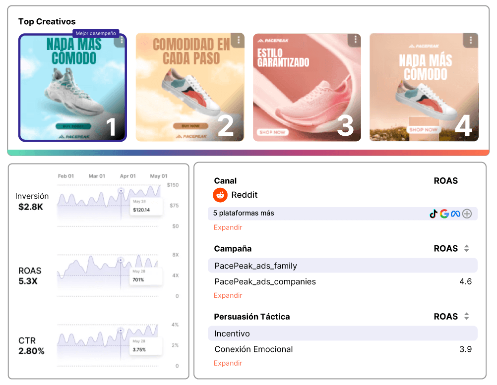 El enfoque omnicanal de Omneky ahora incluye Reddit, lo que le permite rastrear, analizar y optimizar sus campañas desde un panel centralizado. Supervise las conversiones, el alcance, la frecuencia y el retorno del gasto publicitario (ROAS) en todas las plataformas para obtener una imagen completa del rendimiento de su campaña. Con los datos de Reddit integrados junto con otras plataformas, puede realizar ajustes en tiempo real para mejorar los resultados en todos los ámbitos.