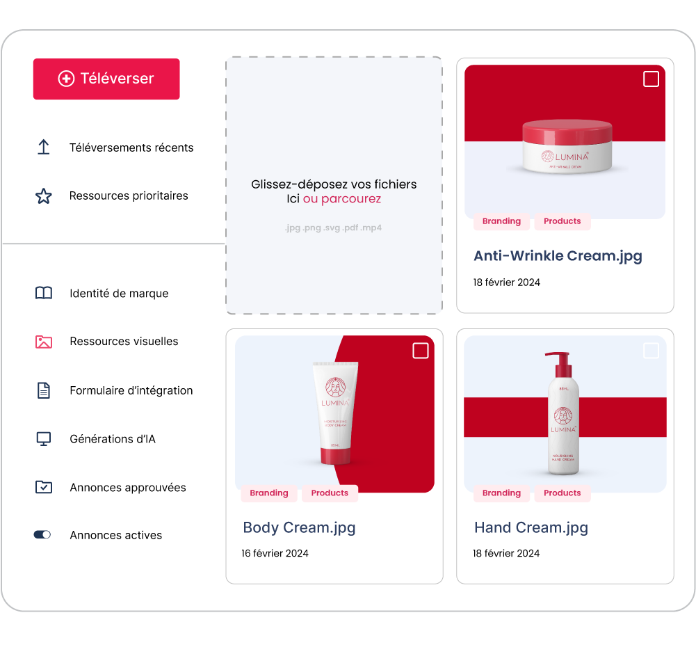 Téléchargez tout votre contenu de marque sur la plateforme de gestion des ressources numériques.