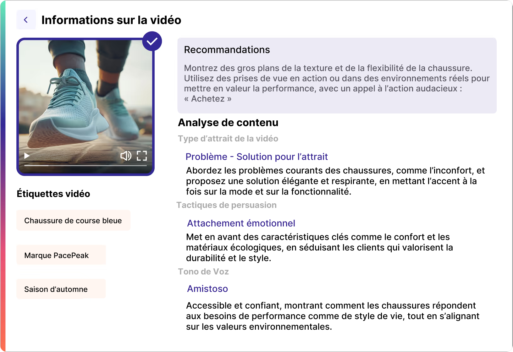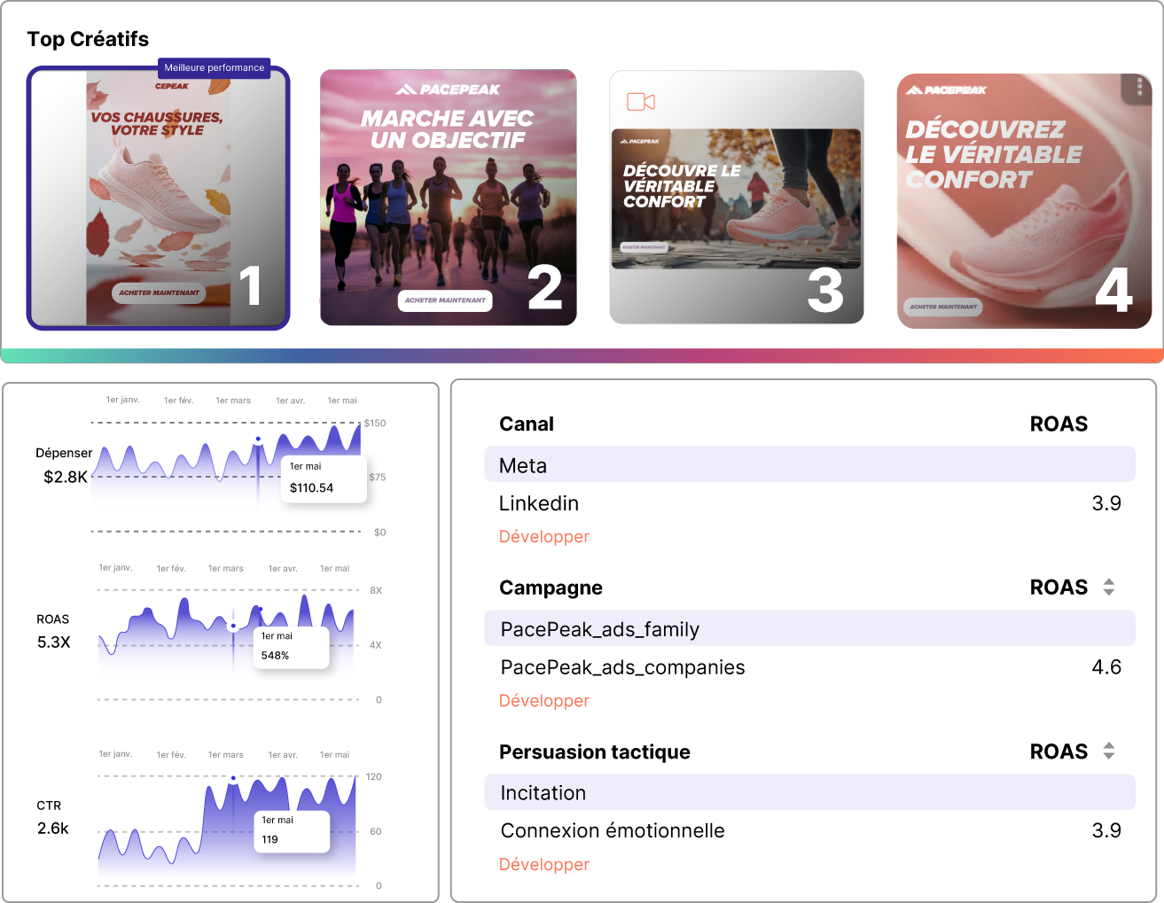 Obtenez des recommandations personnalisées pour améliorer vos créations en fonction des données de performance propres à chaque canal. Apprenez à optimiser vos visuels pour chaque plateforme, en garantissant un impact maximal et une cohérence sur l’ensemble de la présence de votre marque.