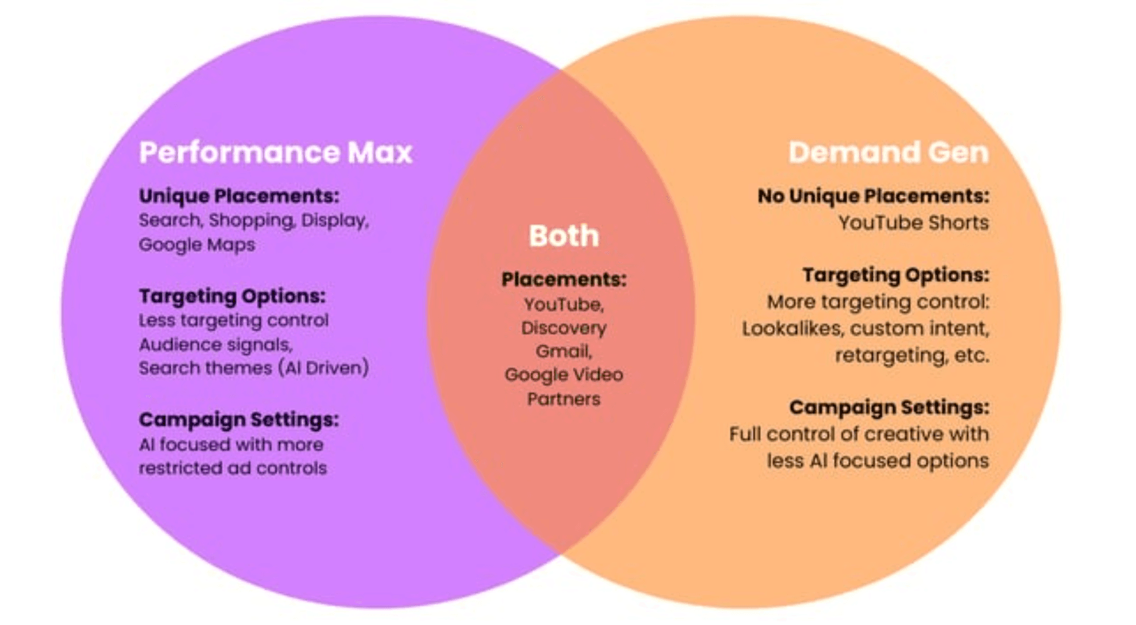 First, let’s clarify the key differences between PMAX and Demand Gen campaign types and where they overlap.