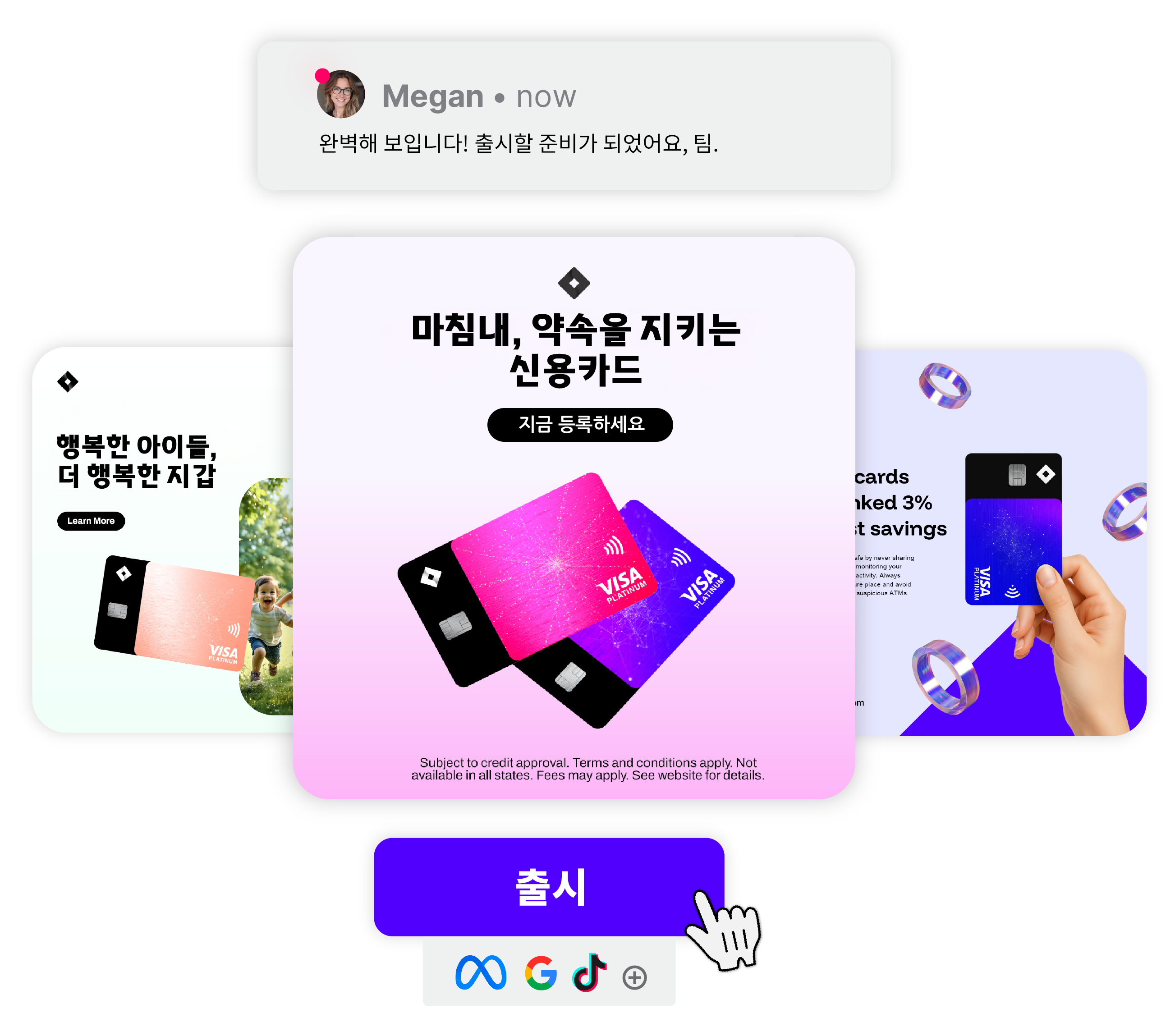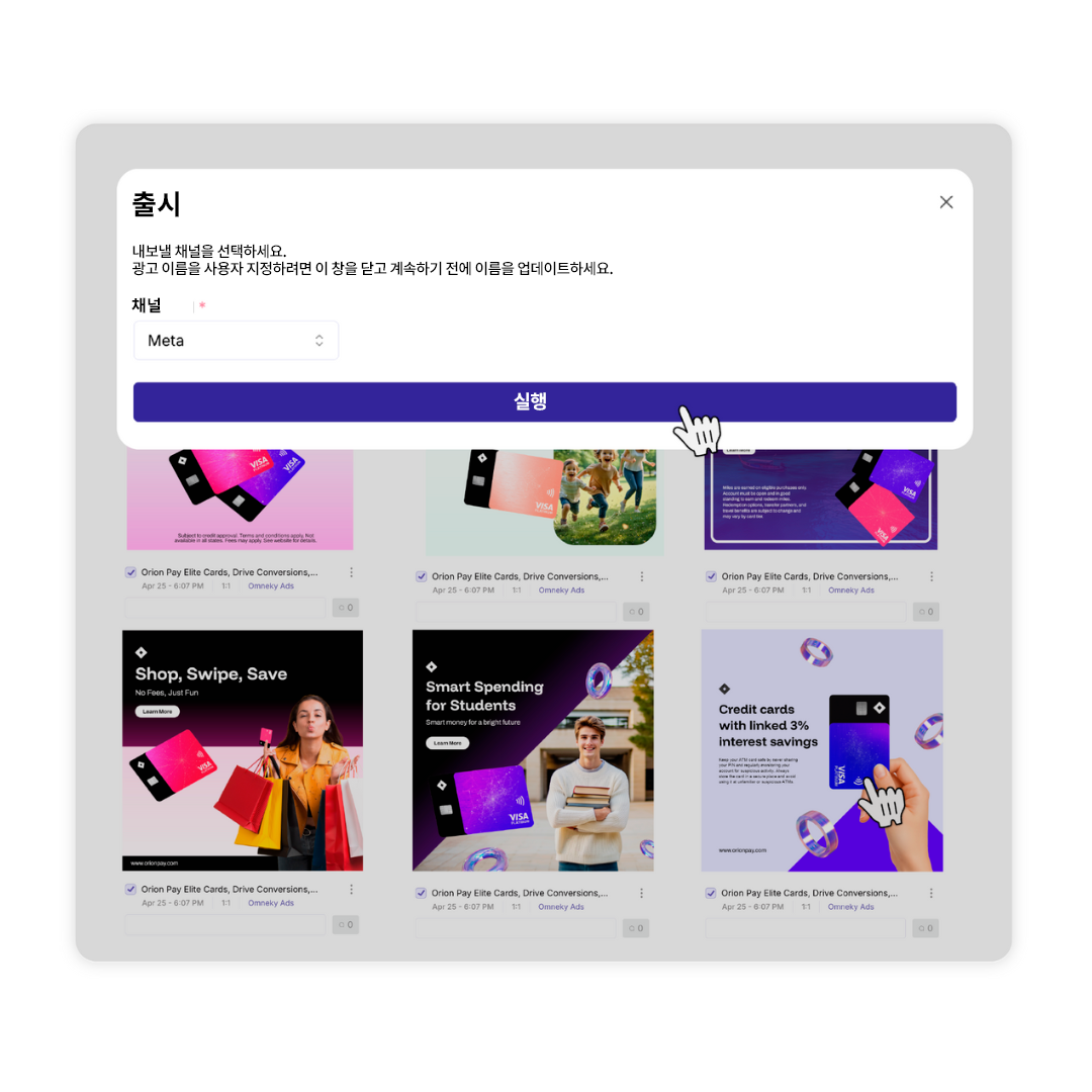 게시하려는 광고를 선택하고 플랫폼을 선택한 다음 출시를 누릅니다.여러 플랫폼에서 탭을 전환하거나, 파일을 내보내고 업로드하거나, 일치하지 않는 UI를 해독할 필요 없이 광고가 바로 게재됩니다.