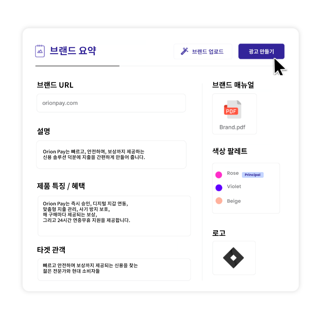 목표와 채널을 기반으로 목표, 잠재고객, 광고 게재 위치를 요약한 맞춤형 크리에이티브 브리프를 생성합니다.브랜드 가이드라인과 이전 캠페인에서 가장 실적이 좋은 요소를 활용하여 전략과 실행을 연계합니다.
