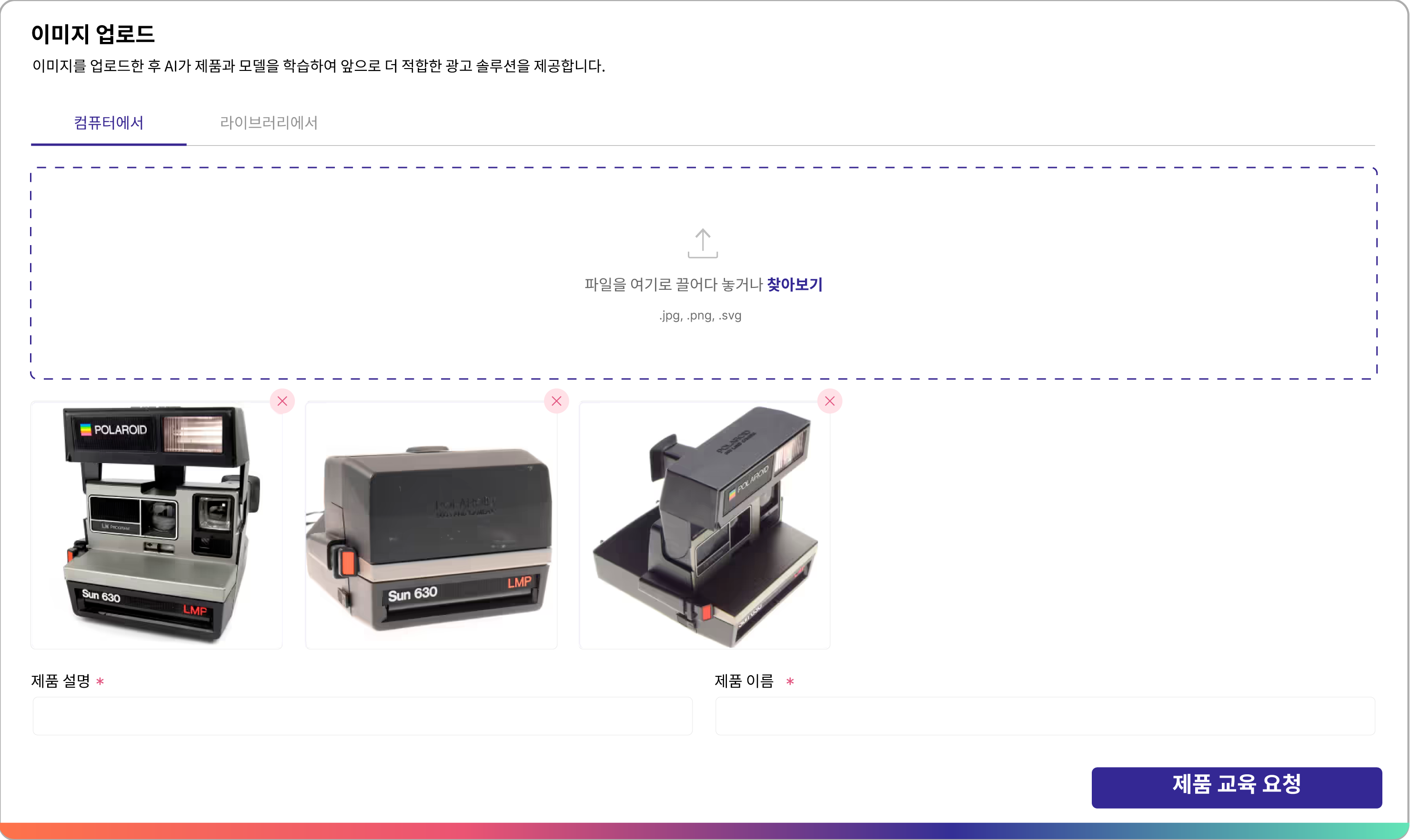 제품 이미지를 업로드하면 AI가 즉시 학습하여 필요에 맞게 조정되고 전자 상거래와 광고에 최적화된 고품질 비주얼을 몇 분 만에 제공합니다.