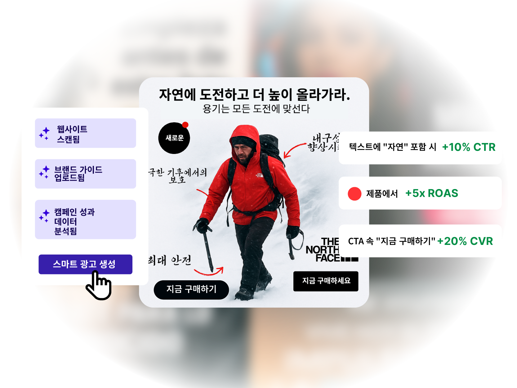 마케터에게는 그 어느 때보다 많은 콘텐츠가 필요하지만 기존 프로덕션은 너무 느립니다.AI로 생성한 크리에이티브는 확장에 도움이 되지만 어떤 것이 효과적인지에 대한 인사이트가 부족합니다.스마트 광고는 자동화된 광고 제작, 성과 데이터, 지속적인 크리에이티브 테스트를 통해 격차를 해소하므로 모든 광고가 실적에 최적화됩니다.