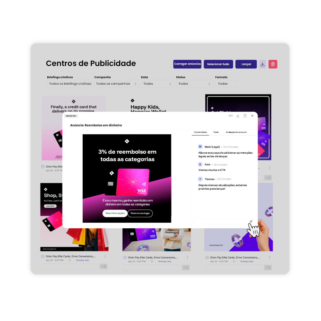 Sim O Ad Launcher oferece suporte a fluxos de trabalho que exigem muita conformidade com ferramentas de aprovação integradas. É ideal para equipes de fintech, saúde, CBD e outros setores regulamentados, onde a revisão legal é essencial.
