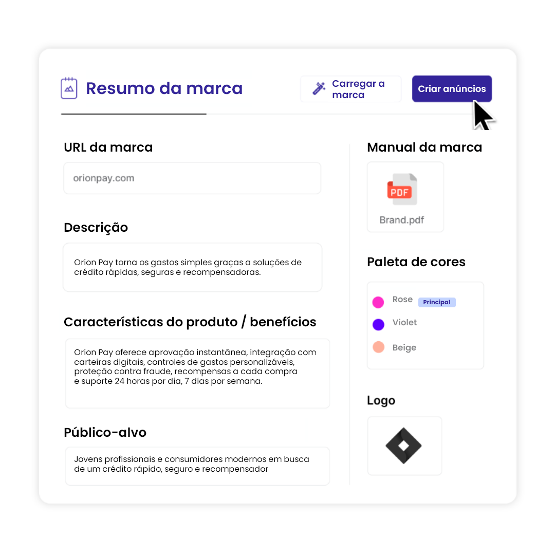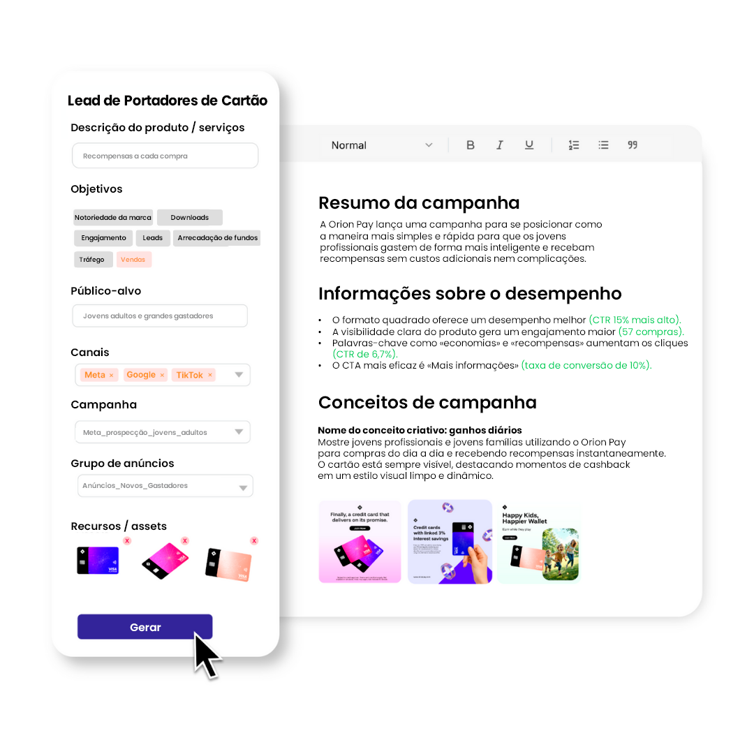 Com base em suas metas e canais, geramos um resumo criativo personalizado que descreve objetivos, públicos e onde seus anúncios serão veiculados. Ele usa as diretrizes da sua marca e os elementos de melhor desempenho de campanhas anteriores para alinhar a estratégia à execução.