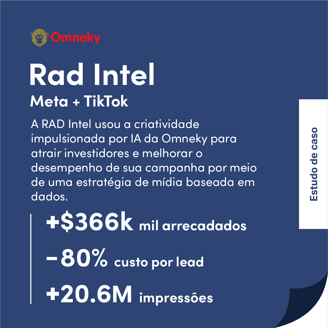 A Omneky fez uma parceria com a RAD Intel para desenvolver uma estratégia criativa voltada para o desempenho, adaptada para o aumento de seus investidores. Por meio dos recursos generativos de IA da Omneky, da rápida implantação criativa e da plataforma de análise baseada em dados, a RAD Intel conseguiu lançar campanhas ousadas e de alto desempenho que geraram resultados reais.