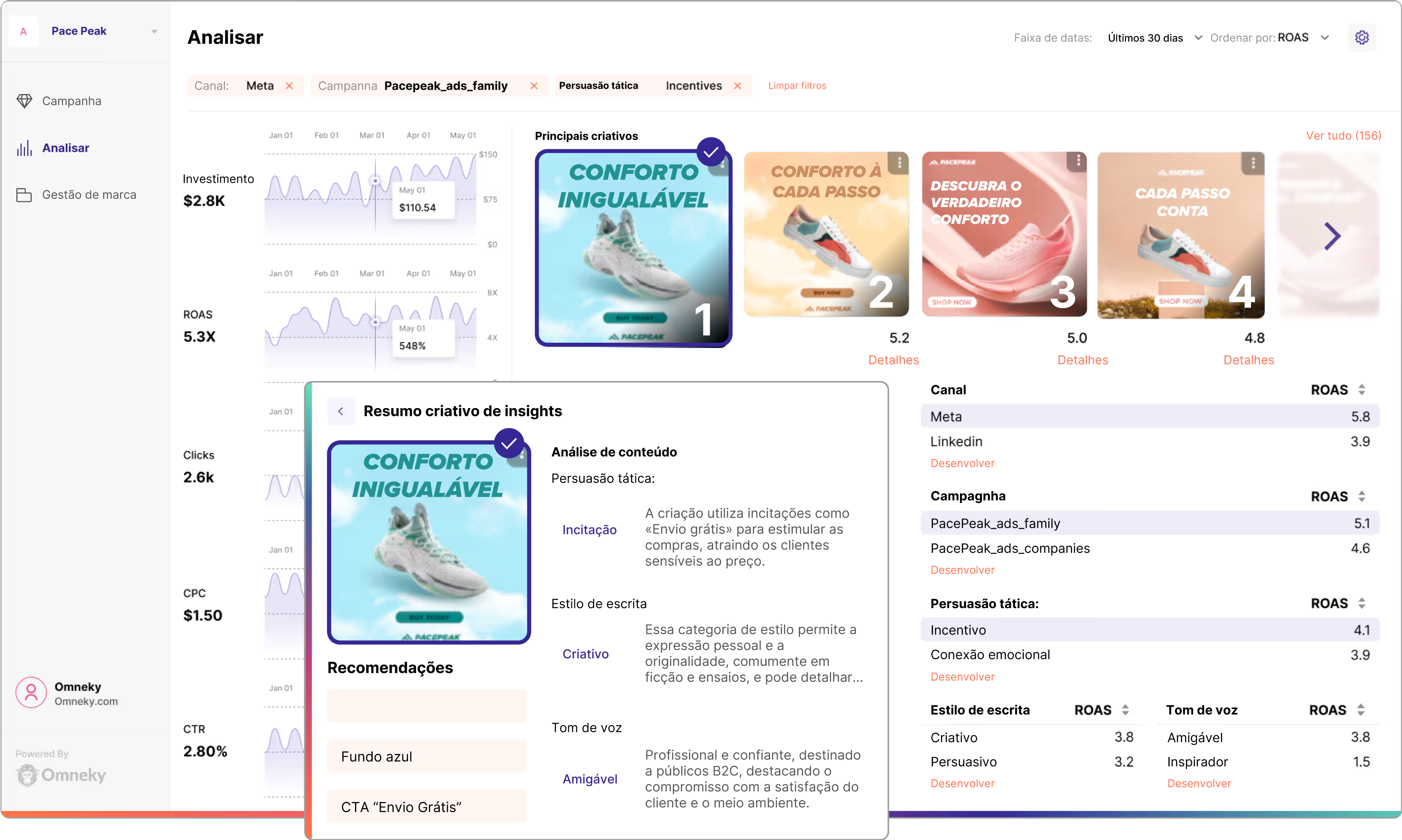 Entenda o sucesso do seu anúncio com insights detalhados. O Creative Analytics da Omneky revela criativos, canais e campanhas de alto desempenho, ajudando você a otimizar esforços futuros.