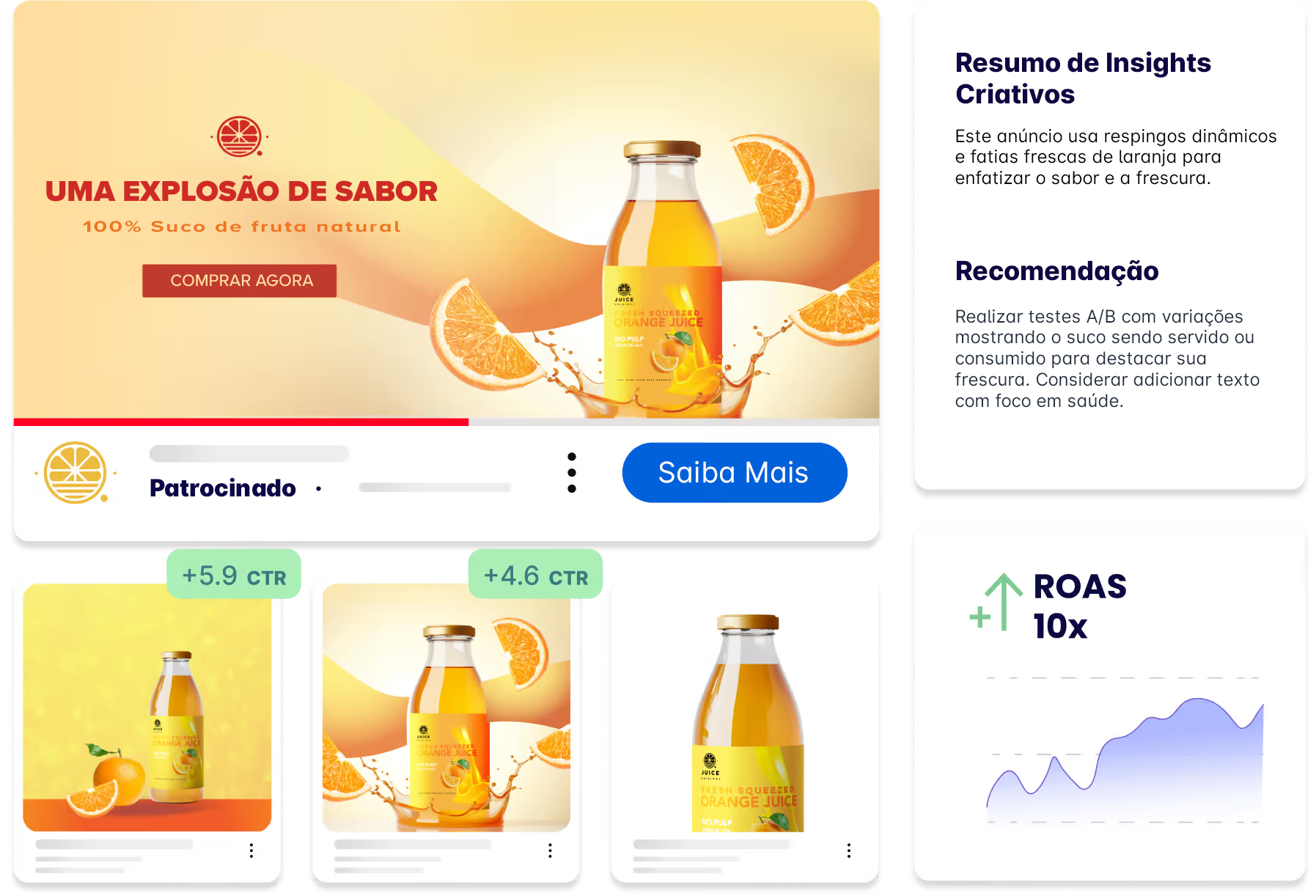 Coloque insights baseados em dados sobre as gerações automatizadas de anúncios. Saiba o que está gerando resultados e por quê. Obtenha relatórios com inteligência artificial e pontuações preditivas para seu anúncio criativo.