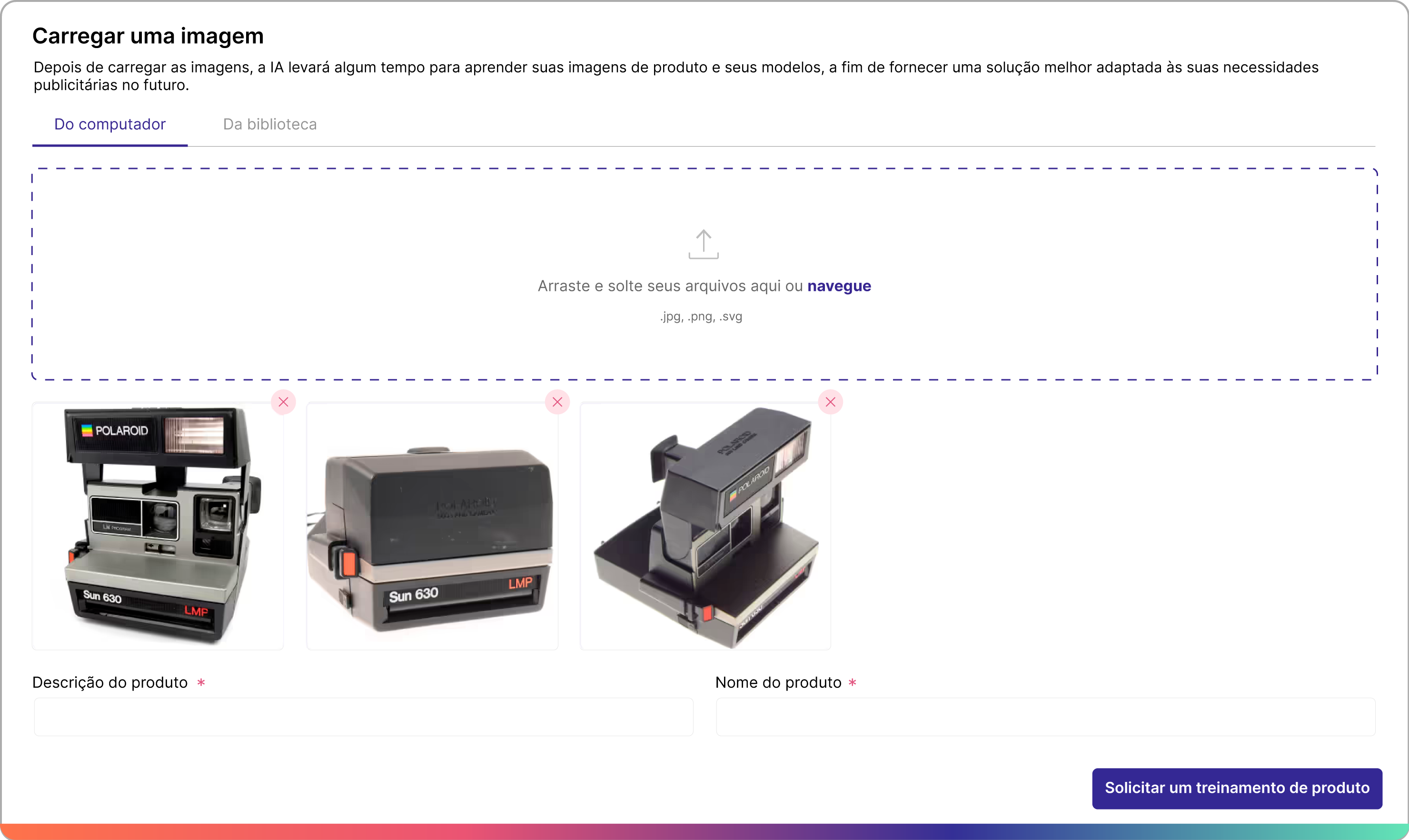 Faça upload das imagens de seus produtos e nossa IA as treina instantaneamente para fornecer imagens de alta qualidade, adaptadas às suas necessidades e otimizadas para comércio eletrônico e publicidade em minutos.